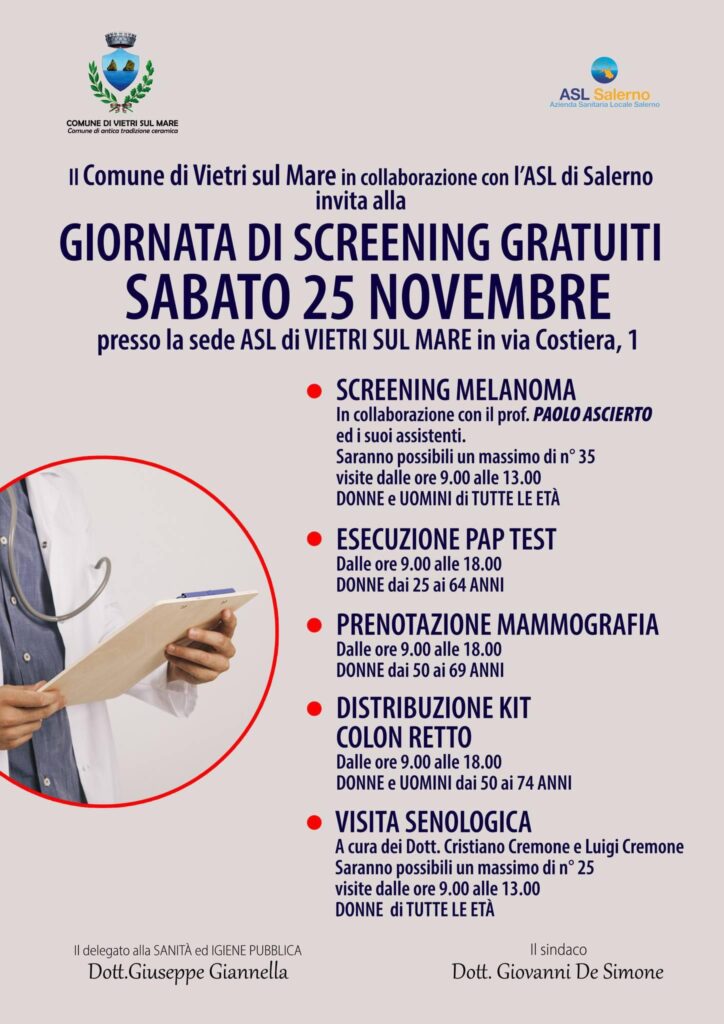 Giornata di Screening gratuiti effettuata il 25 Novembre 2023 presso la sede comunale dell’Asl con la partecipazione del Prof Paolo Ascierto per screening Melanoma, esecuzione Pap Test, prenotazione mammografia, distribuzione kit colon retto e visite senologiche.
